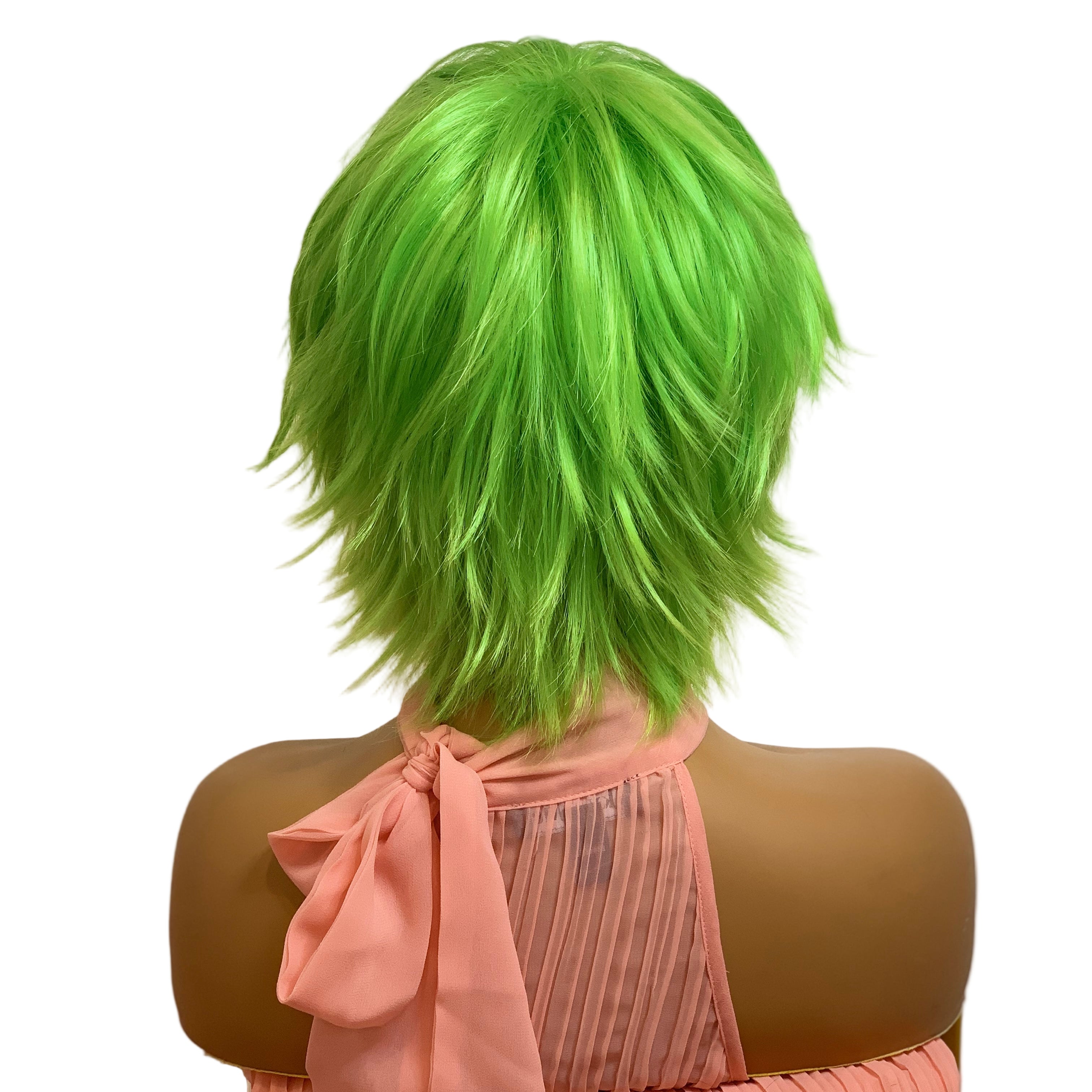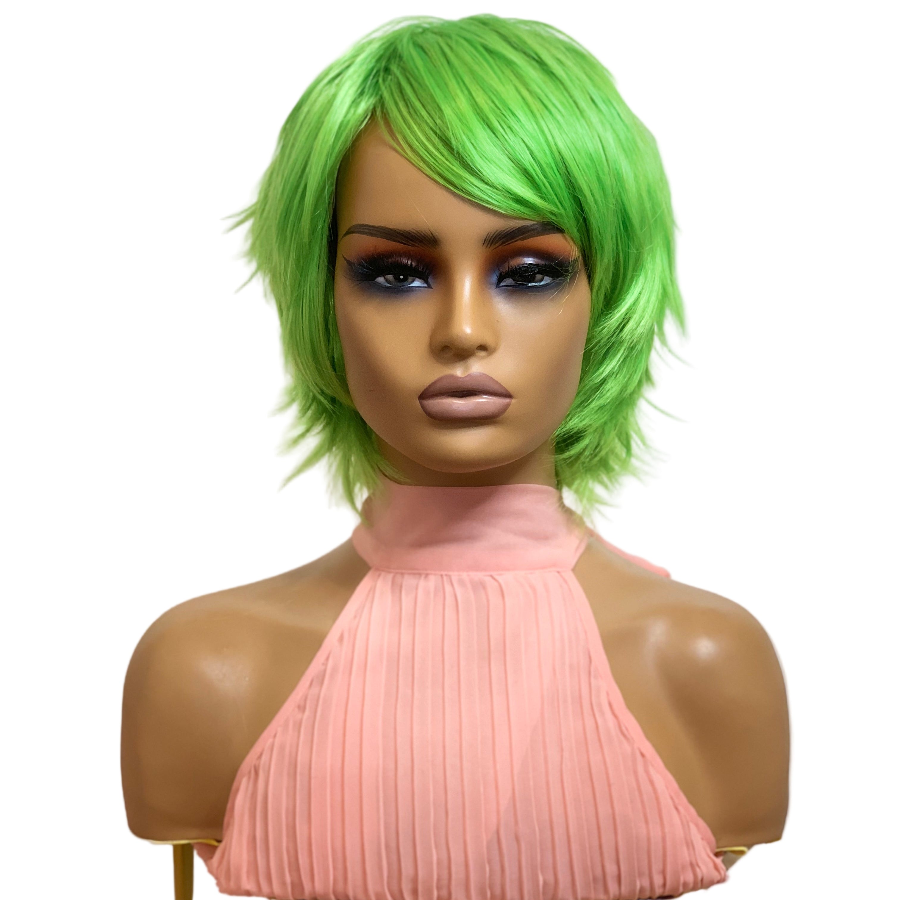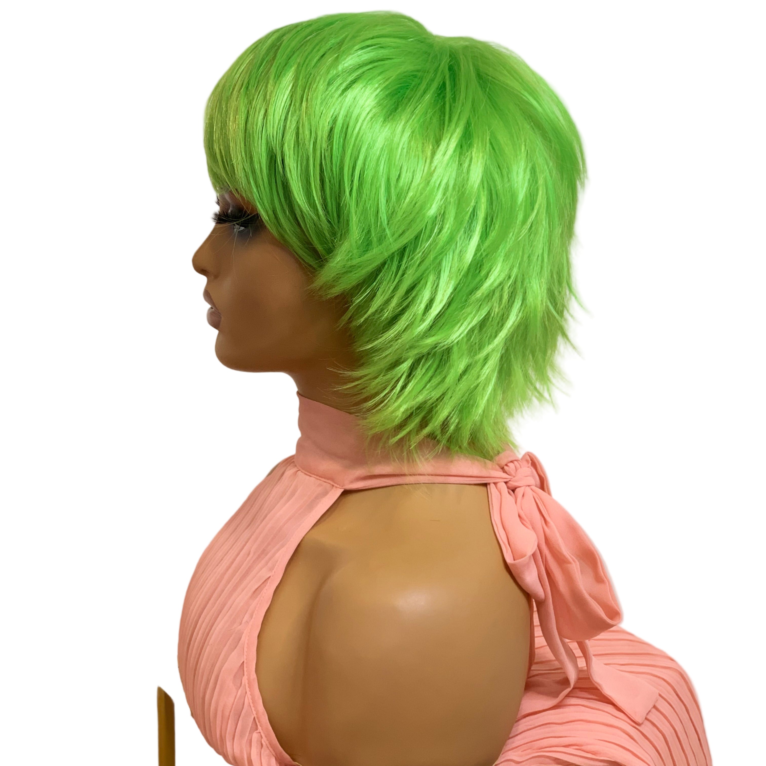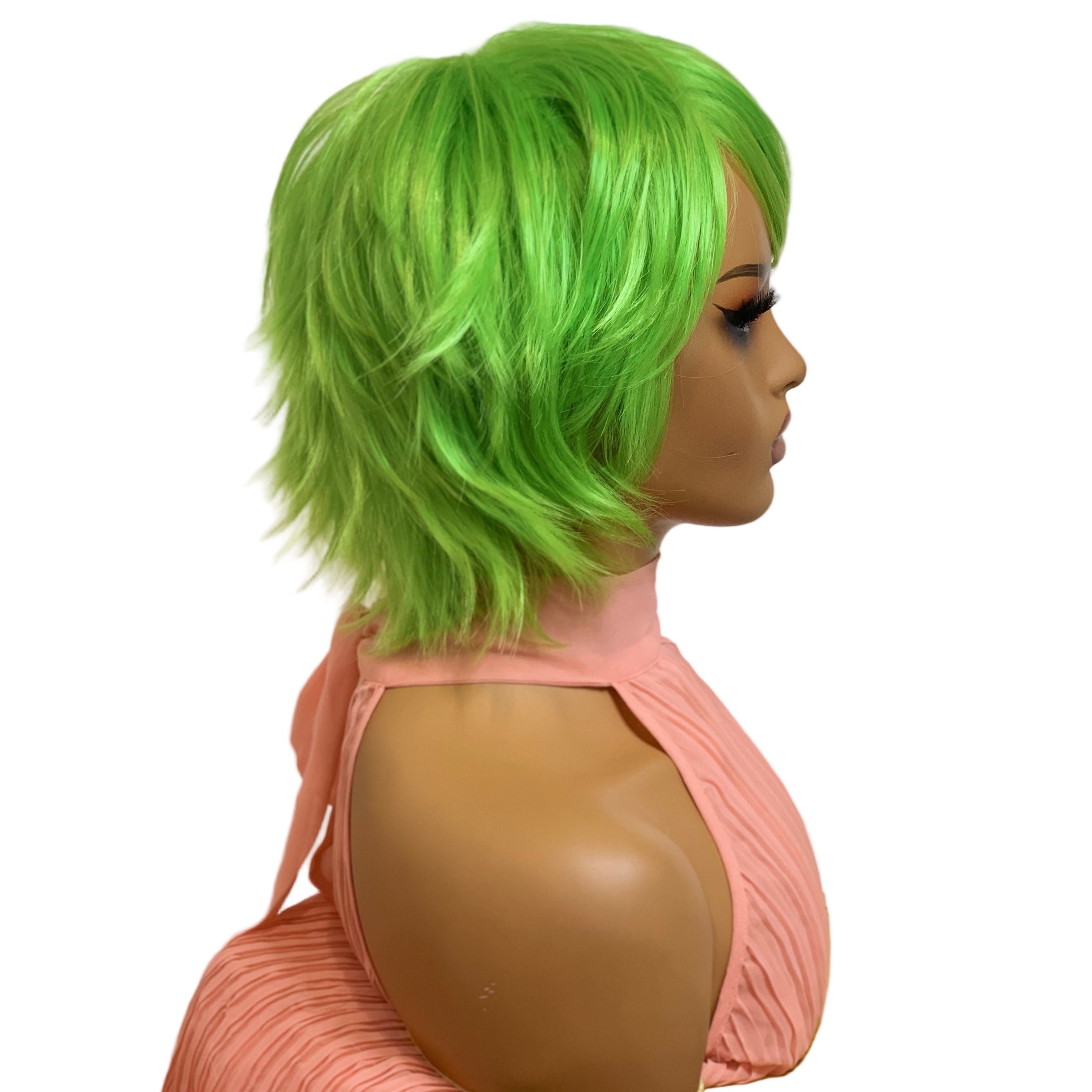 "Transform into a vibrant and bold version of yourself with the Jody wig. This high-quality synthetic wig features a striking bright green color and a sleek straight look, perfect for any party or special event. Make a statement and stand out from the crowd with Jody!"